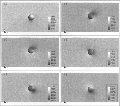 Figure 3 shows a plot of the time evolution of the vertical displacement of the sphere. The position of the sphere at different time intervals is shown in Figure 4. A plot of velocity vectors in the fluid displayed on Figure 5. Pressure contours in the fluid domain are shown in Figure 6.