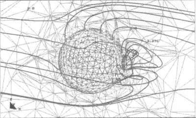 The streamlines in the vecinity of the sphere at a certain time are shown in Figure 7. Figure 8 shows contours of the surface wave elevation at two particular times.