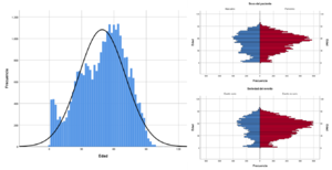 Gráfico 1. Histograma de frecuencias y pirámide de distribución de la edad por las variables sexo y seriedad del evento.