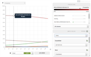 La aplicación del algoritmo analítico bajo la ruta de aprendizaje supervisado llevado a cabo en la plataforma abierta en línea BigML generó una adecuada clasificación para el estado de salida en un 84,5%. En el gráfico 2 se presenta el resultado de la predicción del algoritmo bajo los parámetros: femenino, 20 años, ruta de administración conjuntival y causalidad definitiva del evento (predicción recuperado resuelto = 91,54%). Para el mismo caso en donde el medicamento sea indicado por vía oral, se predice un estado final recuperado resuelto del 76,42% (gráfico 3).