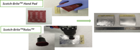 El primer tratamiento seleccionado se basa en el lijado manual de la superficie. Los abrasivos estudiados han sido papel de lija de 180 grit, 1500 grit y Scotch-BriteTM Hand Pad 7447. Adicionalmente, también se empleó Scotch-BriteTMRolocTM médium grit diseñado para su uso con una herramienta Dremmel tal y como se refleja en la figura (1).