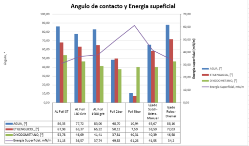 Por esta razón, se decidió complementar los ensayos con la medición de la energía superficial, la cual representa la energía necesaria para romper los enlaces intermoleculares en una superficie. Esta medición proporciona información adicional sobre la capacidad de la superficie para interactuar con el composite, mejorando así el entendimiento de la efectividad del tratamiento superficial.