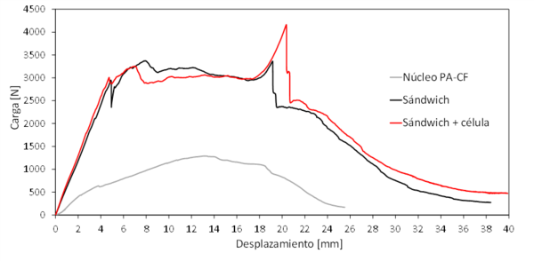 La fuerza máxima del núcleo alcanza 682 N, pero cuando se añaden las fibras de vidrio en las pieles, se obtienen valores de 3615 – 3786 N, 5 veces mayor con las pieles que solamente el núcleo. Pero comparando los paneles sándwich con y sin célula, la diferencia es de 4,5 %. El peso de los paneles sándwich con y sin célula aumenta un 12 %, por lo tanto, se ha calculado la fuerza máxima específica para poder realizar una comparación más ajustada. Se ha observado que la fuerza máxima especifica disminuye 13% insertando la célula.
