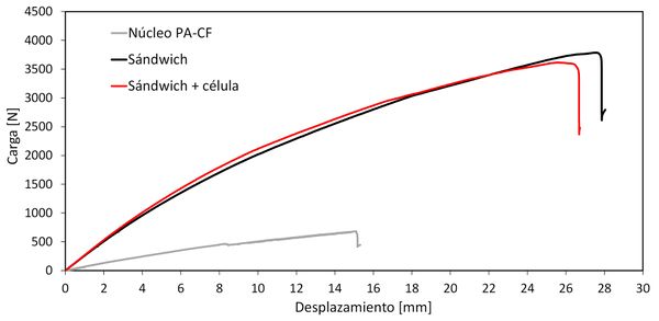 En cuanto a los paneles sándwich con y sin célula, se puede observar cómo hay 3 etapas en cada curva. En primer lugar, la carga aumenta hasta alcanzar un pico máximo, donde se genera el daño en la piel superior y se perfora. A partir del pico, entra la segunda etapa, donde el nucleo se comprime y se daña el núcleo. En la segunda etapa se observa un plato, donde la carga para ambos paneles es igual. Cuando el plato se termina y empieza a incrementar la fuerza, es donde empieza la tercera etapa. En esta última etapa, la piel inferior es el único elemento que queda. En este caso se observan dos comportamientos diferentes para los paneles sándwich. El panel sin la célula alcanza la carga máxima de 3448 N y desciende la carga. En cambio, el panel con la célula alcanza4286 N y desciende hasta obtener la perforación total.