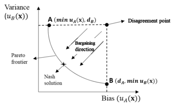 An integration of the Nash bargaining game model involves three steps. First step, the two players and their corresponding utility function should be defined. The process bias can be defined as player A, and variance can be regarded as player B. The RSM-based estimated functions of both responses will be regarded as the players’ utility functions in this bargaining game (i.e., Failed to parse (MathML with SVG or PNG fallback (recommended for modern browsers and accessibility tools): Invalid response ("Math extension cannot connect to Restbase.") from server "https://mathoid.scipedia.com/localhost/v1/":): {\textstyle {\, u}_{A}\left( \boldsymbol{x}\right) \,}