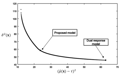 | − | A general bi-objective optimization problem involves simultaneous optimization of two conflicting objectives (e.g., <math>f_1(x)</math>and <math>f_2(x)</math>) that can be described in mathematical terms as <math>\min[f_1(x), f_2(x)]</math> . While in RPD, since it can be infeasible to minimize the process bias and variance simultaneously, a simultaneous optimization of these two process parameters, which are separately estimated by applying RSM, is then transforms to a tradeoff problem between the process bias and variance. This tradeoff problem can be formally expressed as a bi-objective optimization problem [23] as:<span id='cite-_Ref76152586'></span> | + | A general bi-objective optimization problem involves simultaneous optimization of two conflicting objectives (e.g., <math>f_1({\boldsymbol{\text{x}}})</math>and <math>f_2({\boldsymbol{\text{x}}})</math>) that can be described in mathematical terms as <math>\min[f_1({\boldsymbol{\text{x}}}), f_2({\boldsymbol{\text{x}}})]</math> . While in RPD, since it can be infeasible to minimize the process bias and variance simultaneously, a simultaneous optimization of these two process parameters, which are separately estimated by applying RSM, is then transforms to a tradeoff problem between the process bias and variance. This tradeoff problem can be formally expressed as a bi-objective optimization problem [23] as:<span id='cite-_Ref76152586'></span> |