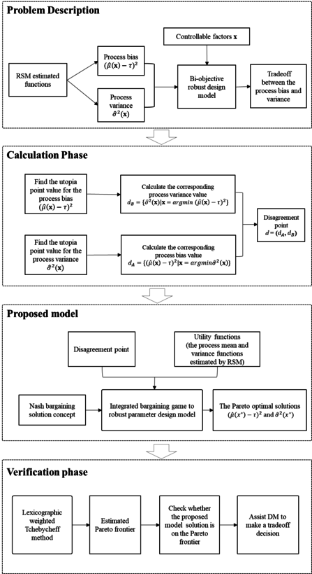The proposed method attempts to integrate bargaining game concepts into the tradeoff issue between the process bias and variance, so that not only the interaction between process bias and variance can be incorporated but also a unique optimal solution can be obtained. The detailed procedure includes problem description, calculation for response functions and disagreement points, bargaining game based RPD model, and verification can be illustrated in Figure 3.