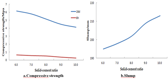 Figure 4 demonstrates the strength (28d,8h) and slump for different fly ash-cement ratio (2.0,3.0,4.0,5.0,6.0). As shown in Fig. 4, with other conditions unchanged, the higher the fly ash-cement ratio, the greater the slump, the better the fuildity, and the lower the compressive strength is. The reason is that the fine particles of fly ash evenly distributed in the cement particles has the micro-aggregate effect to prevent adhesive aggregation of the cement particles, and release some of the residual mixing water between the cement particles, thus improving the slump and fluidity of the paste slurry.
