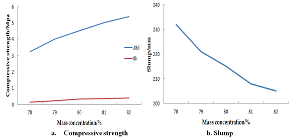 With other conditions unchanged, the higher the mass concentration of the paste, the lower its slump, the worse its fluidity, and the higher the compressive strength is. The higher the solid-cement ratio and fly ash-cement ratio, the greater the slump, the better the fuildity, and the lower the compressive strength is.