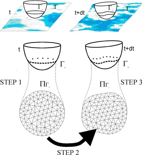 The surface mapping technique used in this work is based on transforming 3D curved surfaces into reference planes. This allows to compute within each plane the local (in-plane) coordinates of the nodes for the final surface mesh accordingly to the changes in the floating line. The final step is to transform back the local coordinates of the surface mesh in the reference plane to the final curved configuration which incorporates the new floating line.