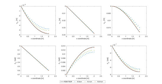 Lastly, we must check whether to process of condensation plus regression gives similar solutions than the full ROM. To so do we have run the same case with the full ROM and the condensed model with 3 different element sizes. Figure 7 shows the displacements and rotations along the beam for the loading case studied (see Figure 3). It can be observed that, as the element size gets closer to 10cm (a point in the database), the 6 DoF solution is able to reproduce the full ROM results. In addition, no instabilities appear in any of the 3 element sizes so we can consider the methodology presented in this work is validated for orthotropic materials.